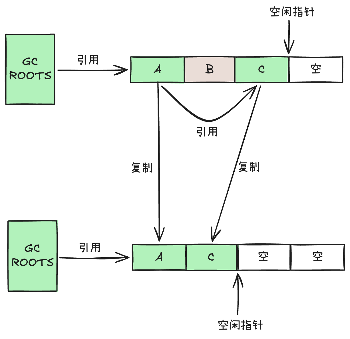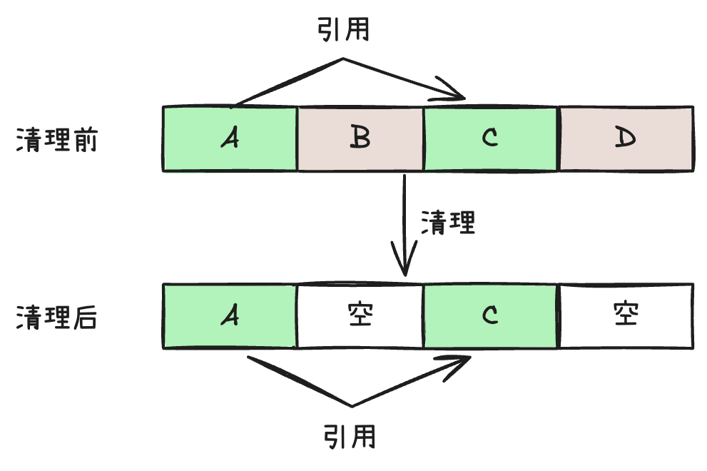 | 内存碎片 | 无 (天然连续) | 标记-整理无碎片;标记-清除有碎片 |