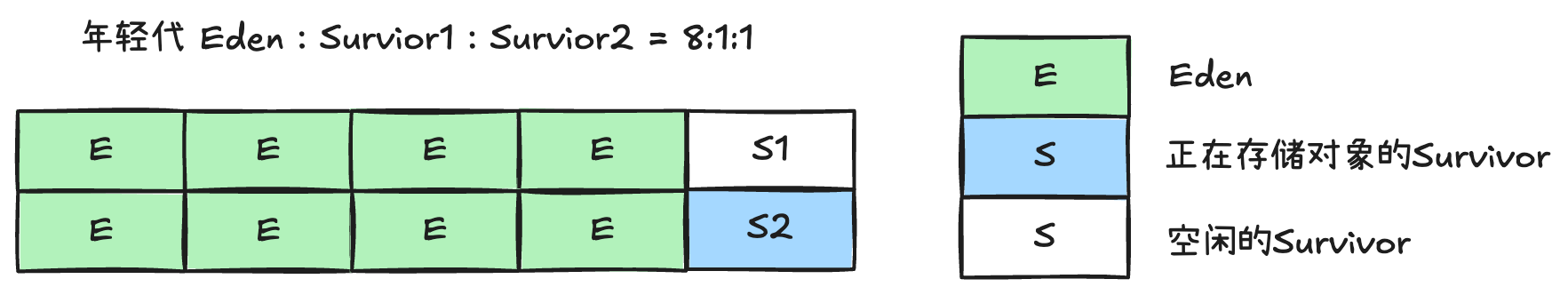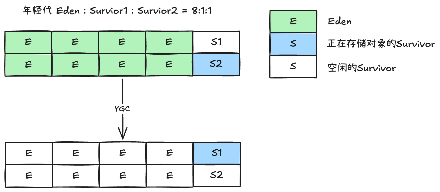 当 YGC 因为“分配失败”被触发时,它的主要任务是清空 Eden 区和部分 Survivor 区。