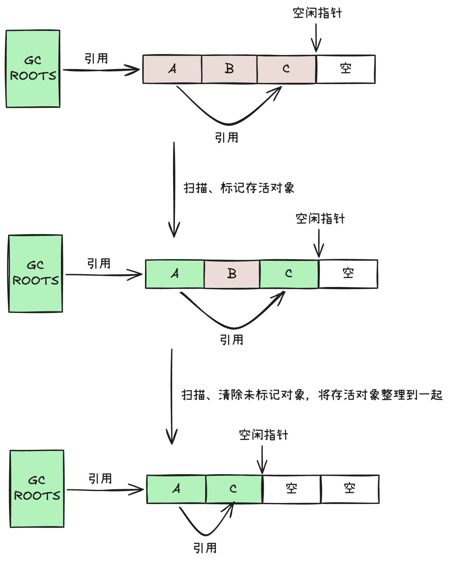 过程:标记-整理算法采用标记-清除算法一样的方式对存活对象进行标记,但在清除时不同,它会先将所有的存活对象往一端空闲空间移动,并更新对应的空闲指针,再清理空闲指针外的内存。