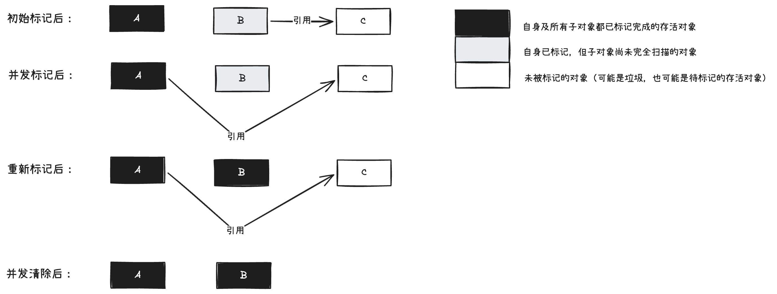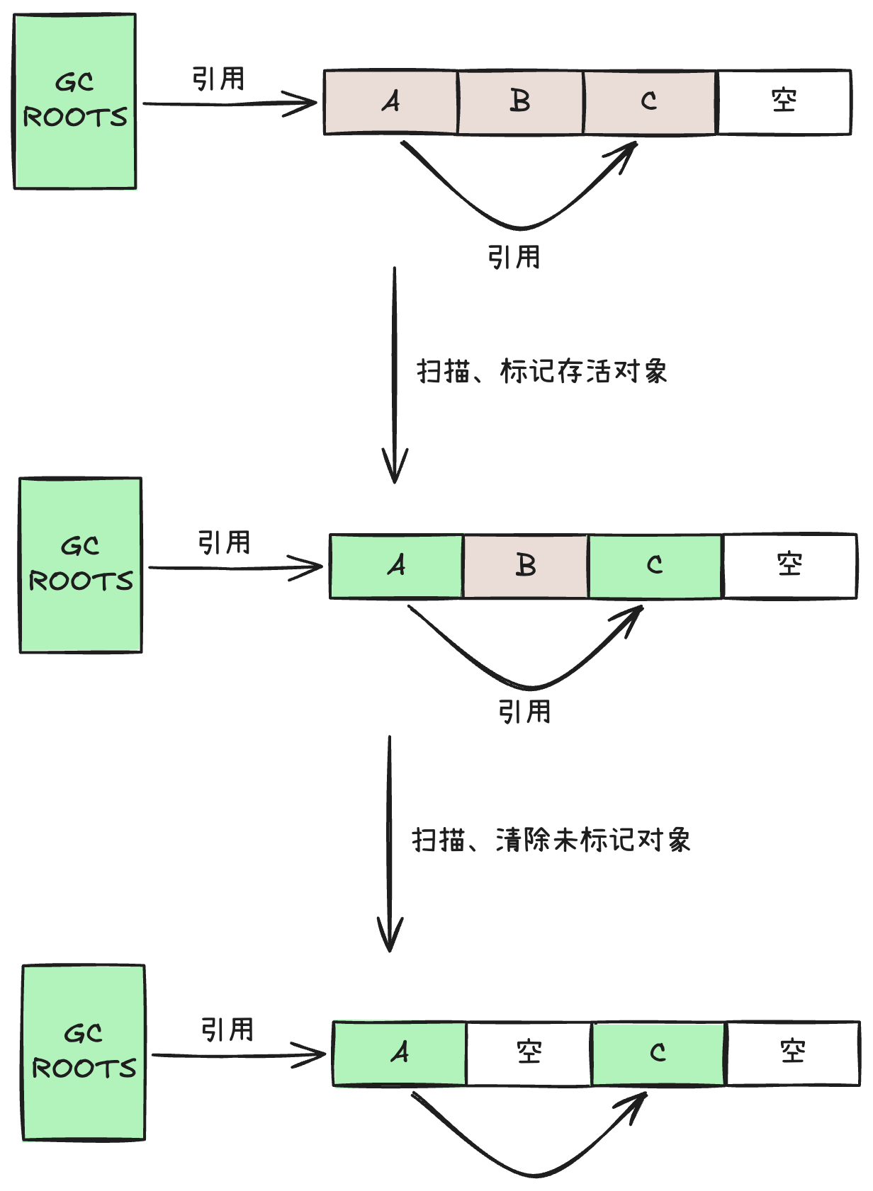 过程:标记-清除算法采用从根集合(GC Roots)进行扫描,对存活的对象进行标记,标记完毕后,再扫描整个空间中未被标记的对象,进行回收,如下图所示。