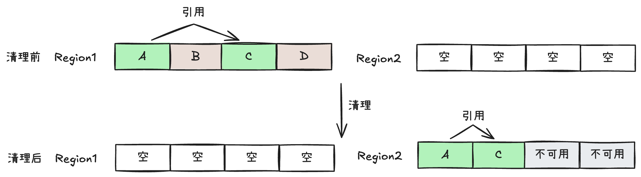 因为每次回收都是把整个 Region 腾空,所以永远不会出现“这个 Region 里这里有个洞、那里有个洞”的情况。