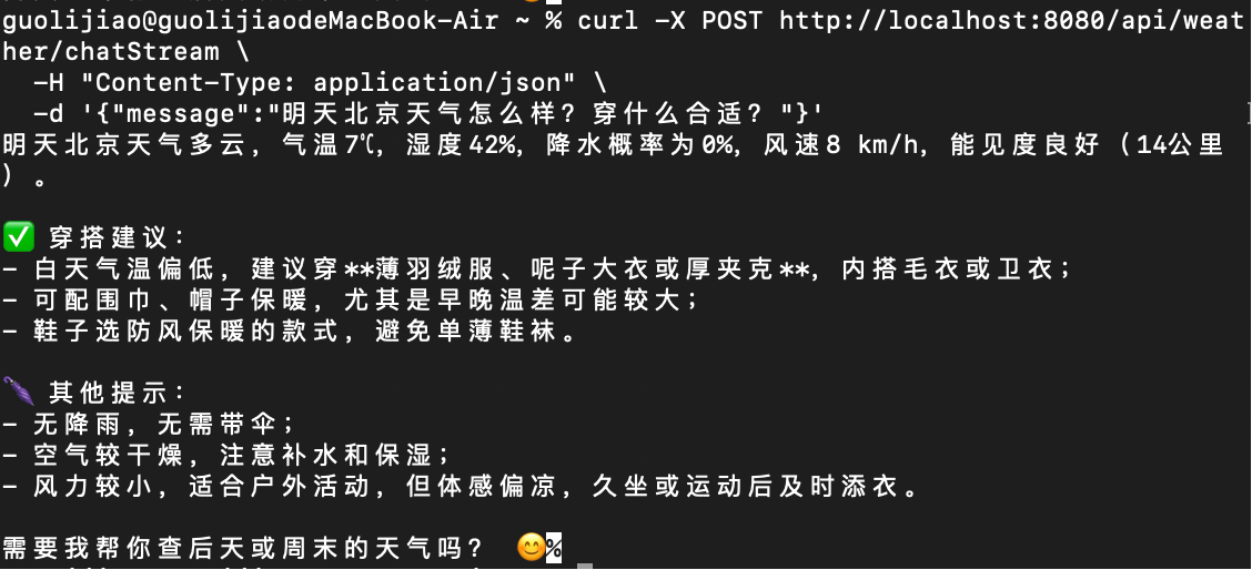 -d '{"message":"明天北京天气怎么样?穿什么合适?"}'4.5.3 输出示例